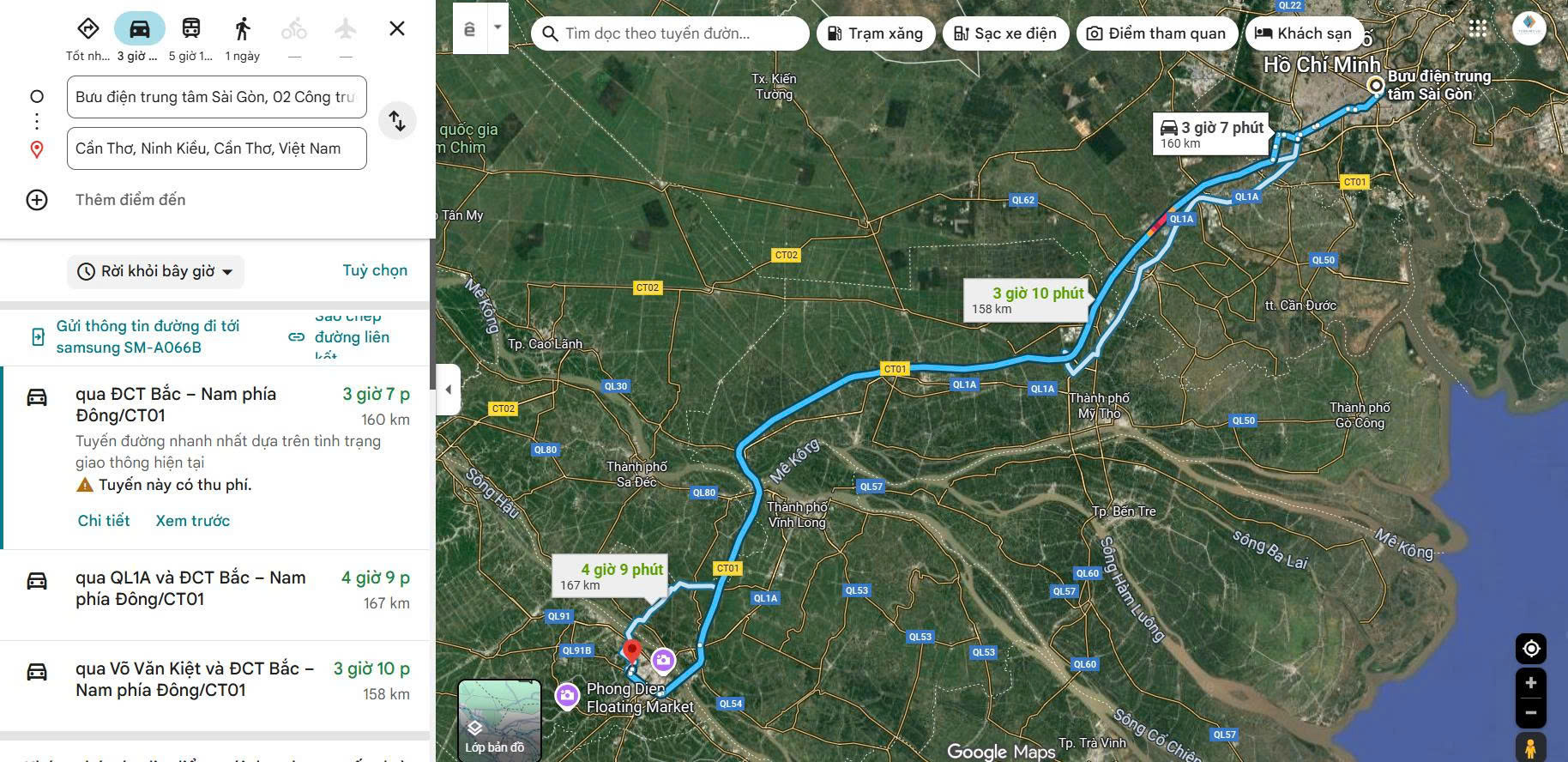 + Di chuyển bằng phương tiện cá nhân: Với thời gian khoảng 3 đến 4 giờ di chuyển du khách có thể theo tuyến cao tốc TP.Hồ Chí Minh - Trung Lương - Mỹ Thuận, sau đó rẽ vào Quốc lộ 1A hướng về Cần Thơ. Đây là cung đường đẹp, dễ đi, hai bên là ruộng đồng và những cây cầu lớn đặc trưng miền Tây. Hình thức di chuyển này phù hợp với những ai thích sự tự do, có thể dừng chân thưởng thức hủ tiếu Mỹ Tho, chụp ảnh bên cầu Mỹ Thuận hay nhâm nhi cà phê ven sông Tiền.