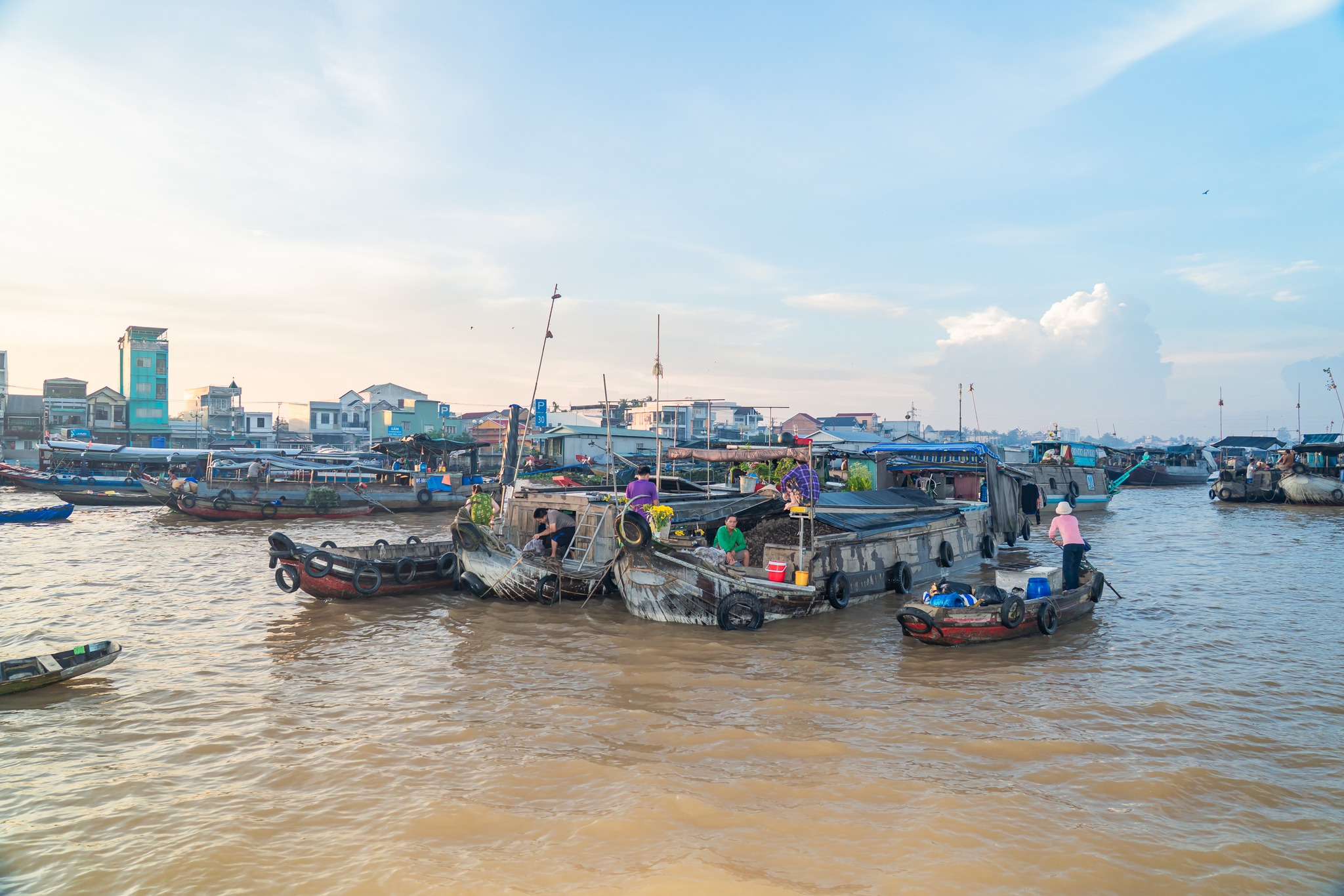 + Thời điểm lý tưởng để tham quan chợ nổi là vào sáng sớm khoảng từ 4h đến 7h sáng. Đây là lúc khu chợ nhộn nhịp nhất, ghe thuyền tấp nập mua bán, tiếng nói cười vang vọng khắp mặt sông. Du khách vừa có thể ngắm bình minh rực rỡ vừa cảm nhận trọn vẹn nét đẹp đời sống sông nước miền Tây.