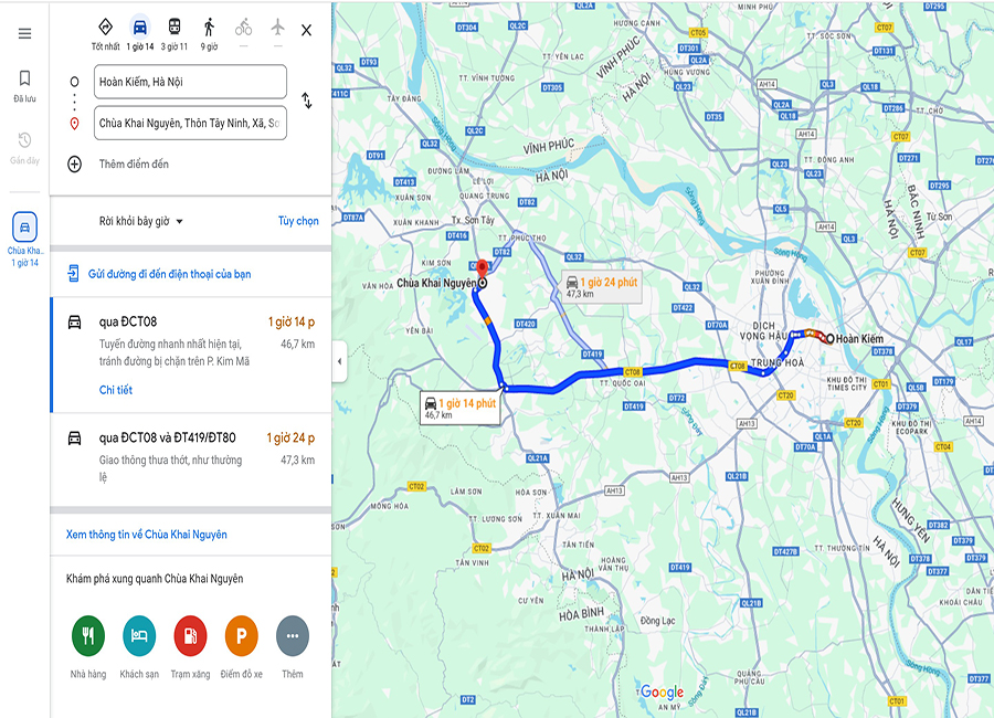 {Chùa Khai Nguyên Sơn Tây} nằm cách trung tâm thị xã Sơn Tây 9,3km, cách trung tâm thủ đô Hà Nội 46,7km và 1 giờ 14 phút di chuyển đường bộ theo chỉ dẫn Google Maps. Từ thủ đô Hà Nội di chuyển đến chùa Khai Nguyên vô cùng dễ dàng với nhiều loại hình phương tiện di chuyển như: Xe máy, ô tô, xe khách, xe buýt…Bạn có thể tham khảo hướng dẫn chi tiết như sau: