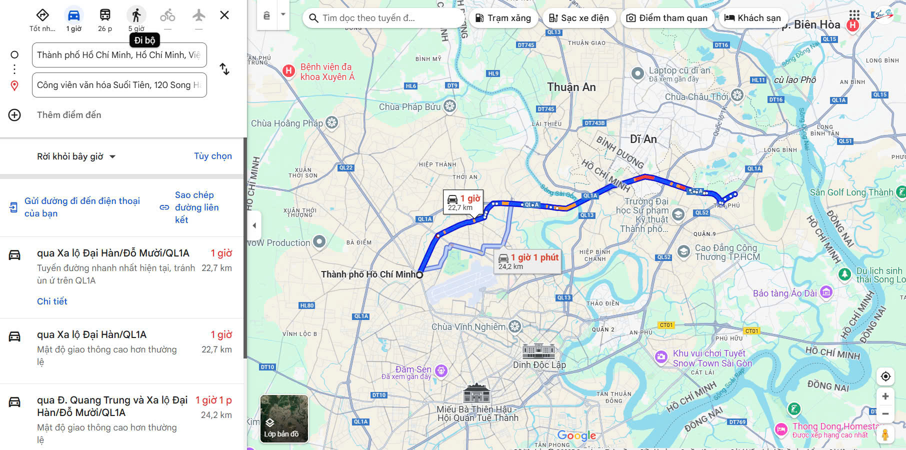 + Di chuyển bằng phương tiện cá nhân: Từ trung tâm thành phố Hồ Chí Minh, du khách có thể tự lái xe theo lộ trình: qua hầm Thủ Thiêm → đại lộ Mai Chí Thọ → Xa lộ Hà Nội → Suối Tiên. Thời gian đi mất khoảng 50 phút tuỳ tình hình giao thông. Đây là lựa chọn linh hoạt, thuận tiện cho các nhóm bạn hoặc gia đình.