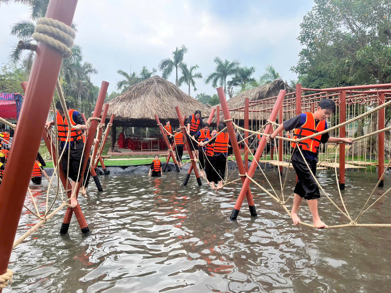 + Khu Sasuke (trò chơi vận động liên hoàn): Là thiên đường cho những ai mê thử thách thể lực và độ khéo léo. Các chướng ngại vật được thiết kế liên hoàn như leo, trèo, giữ thăng bằng, vượt chướng ngại, mô phỏng dạng trò chơi Sasuke phiên bản nhẹ nhàng, phù hợp với học sinh. Hoạt động này giúp rèn sự dẻo dai, phản xạ nhanh, tinh thần kiên trì và cả khả năng cổ vũ, hỗ trợ lẫn nhau trong nhóm.
