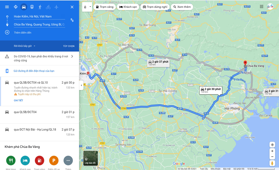 + Đi chùa Ba Vàng bằng ô tô cá nhân: Theo gợi ý chỉ dẫn thuận tiện nhất của Google Maps và cũng là cung đường đại đa số du khách lựa chọn. Từ Hà Nội du khách đi Cầu Thanh Trì > Cao tốc Hà Nội - Hải Phòng, tới trạm thu phí An Lão thì thoát ra chạy thảo QL10 hướng về TP Uông Bí là tới được chùa Ba Vàng.