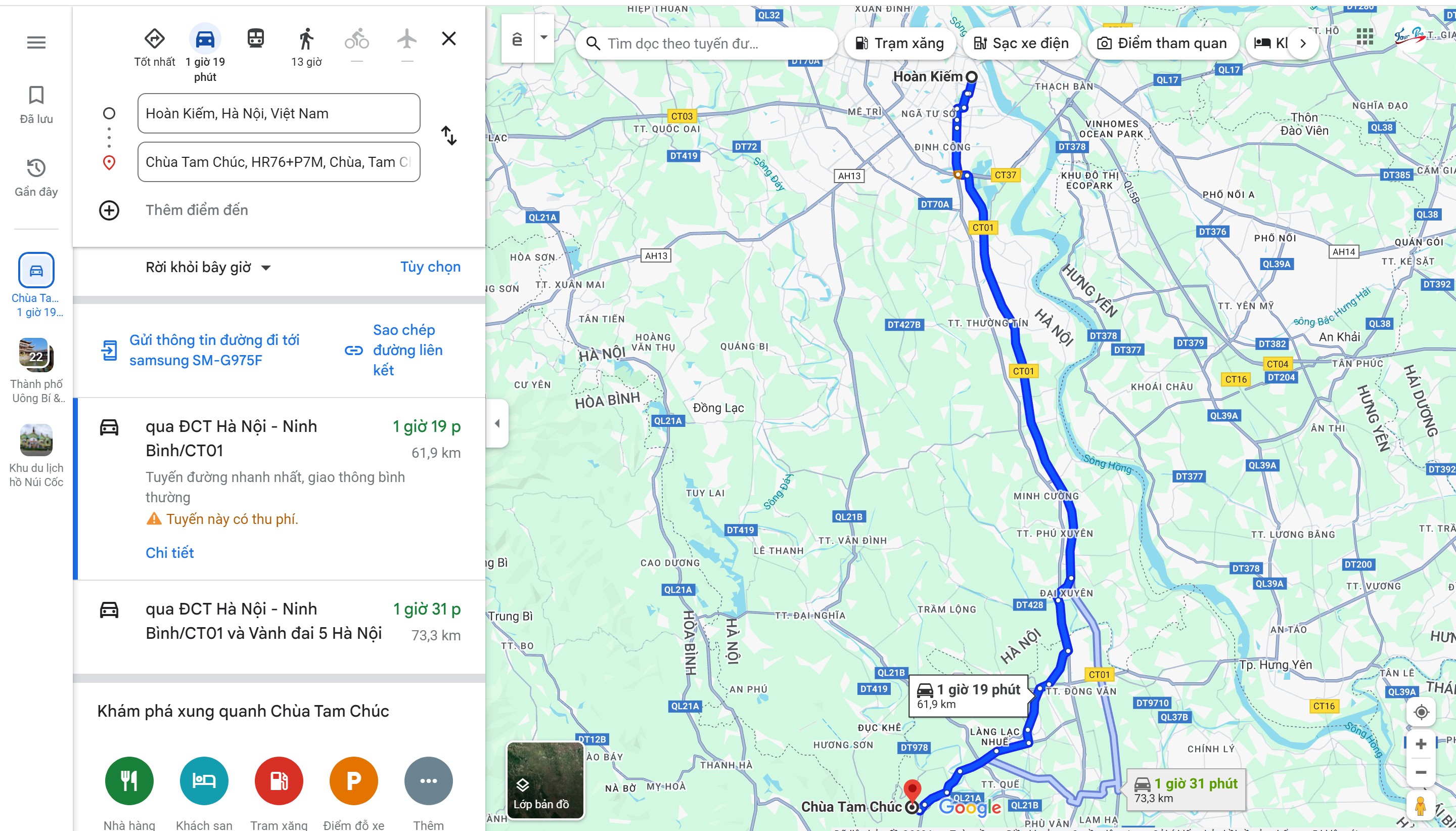 + {Đi chùa Tam Chúc} bằng ô tô: đây là phương tiện được nhiều du khách lựa chọn nhất vì tiện lợi, an toàn và tiết kiệm thời gian. Từ Hà Nội, xe đi theo hướng cầu Thanh Trì, vào cao tốc Hà Nội - Ninh Bình, đến nút giao Đại Xuyên rẽ vào quốc lộ 1A, đến địa phận tỉnh Hà Nam rẽ vào đường 21A, qua xí nghiệp gạch Khả Phong khoảng 4km nữa là đến, tổng thời gian di chuyển khoảng 1h30’ tiếng đồng hồ thôi nhé.