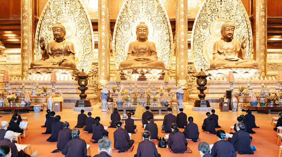 + Tam Điện: công trình nguy nga, tráng lệ, chứa đựng những giá trị Phật giáo có thể lưu giữ hàng trăm năm sau. Đến đây, bạn được chiêm ngưỡng bức tranh phù điêu được làm bằng đá núi lửa được nhập khẩu từ Indonesia và chính do các nghệ nhân nước này chạm khắc kể về các kiếp nhân sinh của Đức Phật, kể về những câu chuyện đong đầy tính nhân văn muốn răn dạy con người ta sống thiện lành, hướng về cái tốt trong cuộc sống xô bồ.