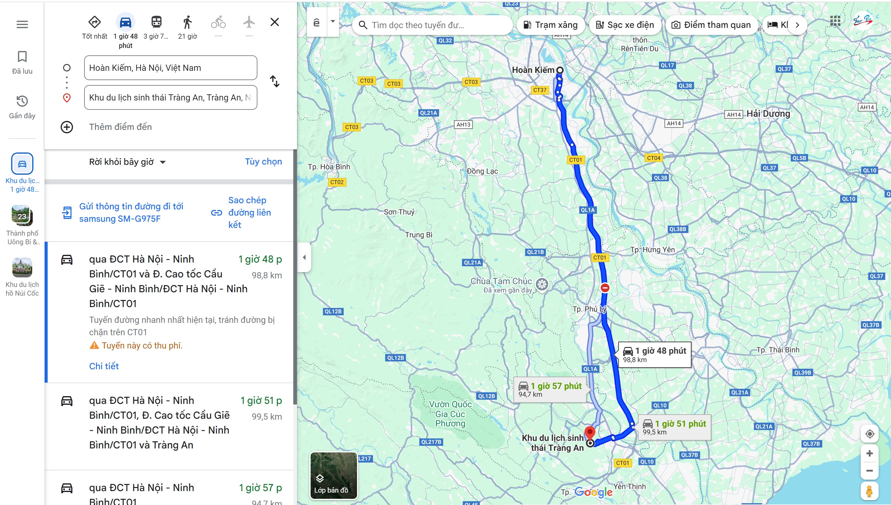 + Đi du lịch Tràng An tự túc, du khách có thể tham khảo ứng dụng chỉ đường Google Maps. Bằng cách tải về điện thoại, sau đó nhập từ khóa “Khu du lịch Tràng An - Ninh Bình” lựa chọn phương tiện ô tô hoặc xe máy dự định di chuyển. Bầm tiếp mục bắt đầu để được chỉ dẫn tuyến đường phù hợp nhất. Ô tô thì sẽ đi cung đường cao tốc, còn xe máy sẽ đi theo quốc lộ 1A cũ nên du khách nên chú ý.
