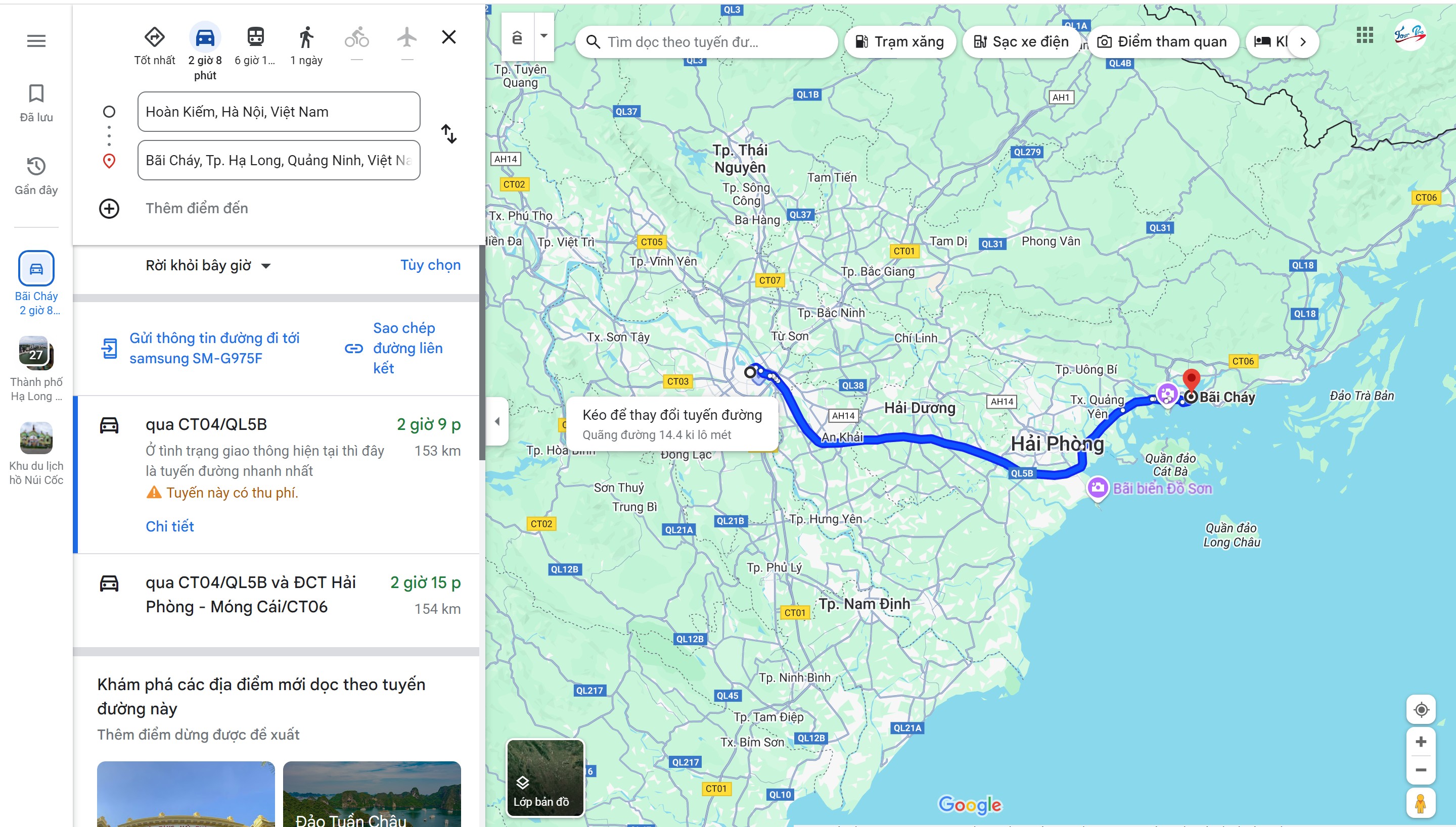 Ngoài ra du khách đi du lịch Hạ Long tự túc bằng các phương tiện cá nhân, có thể tải ứng dụng Google Maps về điện thoại, sau đó nhấp ô tìm kiếm từ khóa {Bãi Cháy Hạ Long}, nhấp chỉ đường và phương tiện dự định di chuyển. Google Maps sẽ lựa chọn tuyến đường thuận tiện nhất cho bạn. Bạn chỉ nhấp thêm bắt đầu để được điều hướng thuận lợi không lo đi nhầm đường.