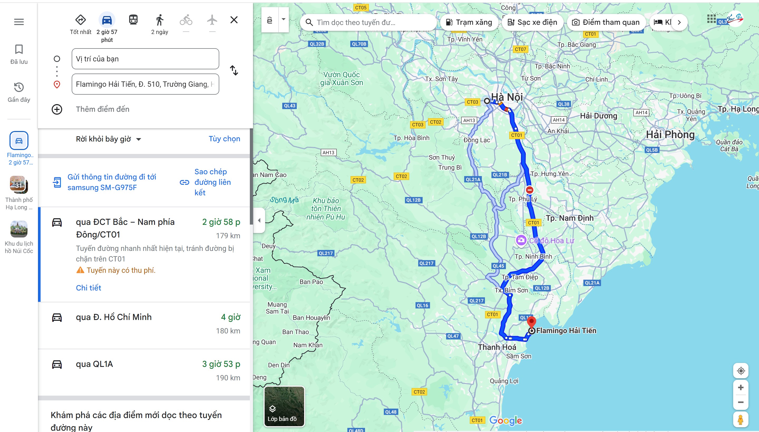 + Ô tô cá nhân là hình thức di chuyển khá chủ động và an toàn: lấy Trung tâm hội nghị quốc gia làm nơi xuất phát, bạn nên lựa chọn đi cao tốc để tiết kiệm thời gian, đi theo cao tốc Hà Nội - Ninh Bình và sau đó nối vào cao tốc Mai Sơn - QL45. Tại nút giao Gia Miêu, bạn đi vào đường Lê Thánh Tông. Đi thẳng đến địa phận xã Quang trung rồi đi theo QL1A. Đi qua đại lý ô tô Thuận Phát, rẽ trái đi về hướng QL10. Trên đoạn đường này, bạn sẽ bắt gặp vòng xuyến, hãy đi theo lối ra vào đường số 6. Bạn tiếp tục lái xe trên đường này là đến bãi biển Hoằng Hóa. Sau khi đi hết đường 510B, tại ngã tư, bạn rẽ theo hướng tay trái lối đi Hải Thanh. Đi dọc đường bờ biển là tới Flamingo Hải Tiến.