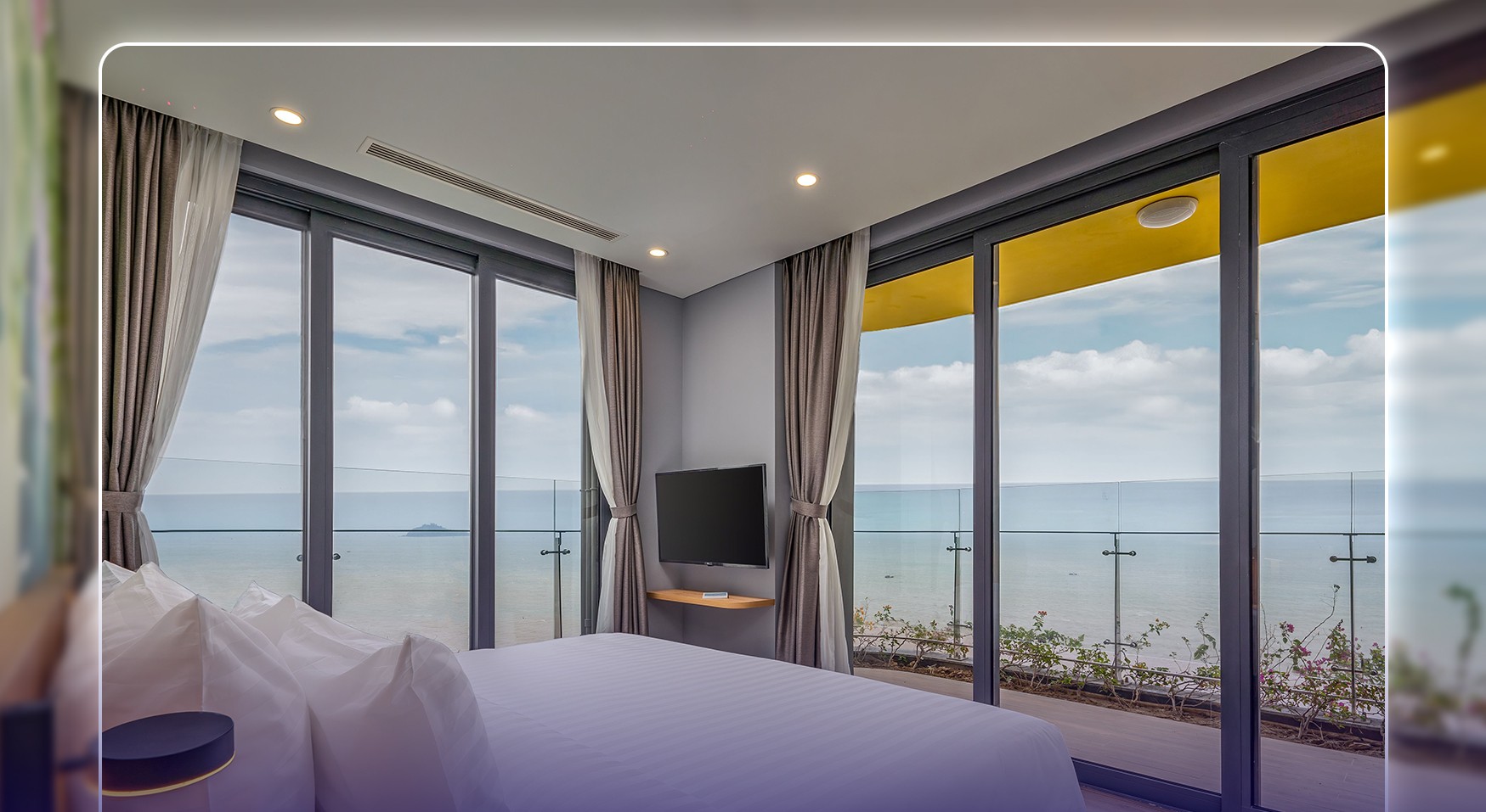 + Sky Villa 1 phòng ngủ: loại phòng này cực kì phù hợp với những đôi bạn trẻ năng động. Phòng có 1 cửa số lớn, có ban công hướng ra mặt biển, bạn tha hồ tận hưởng làn gió mát thổi vào từ đại dương. Không gian phòng được decor vô cùng xinh xắn, bắt mắt, nổi bật với gam màu hồng và màu vàng tươi tắn làm bừng sáng cả không gian phòng. Nhưng không vì thế mà mất đi nét sang trọng đâu nhé, hơn thế lại rất trẻ trung và độc đáo!