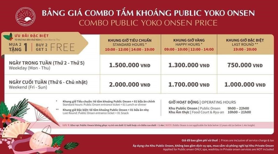 + Gói Onsen gồm vé Onsen + bữa ăn chính ngày cuối tuần với khung giờ tiêu chuẩn 9h00 - 12h00 và 14h00 - 19h00: 2.000.000đ/khách.
