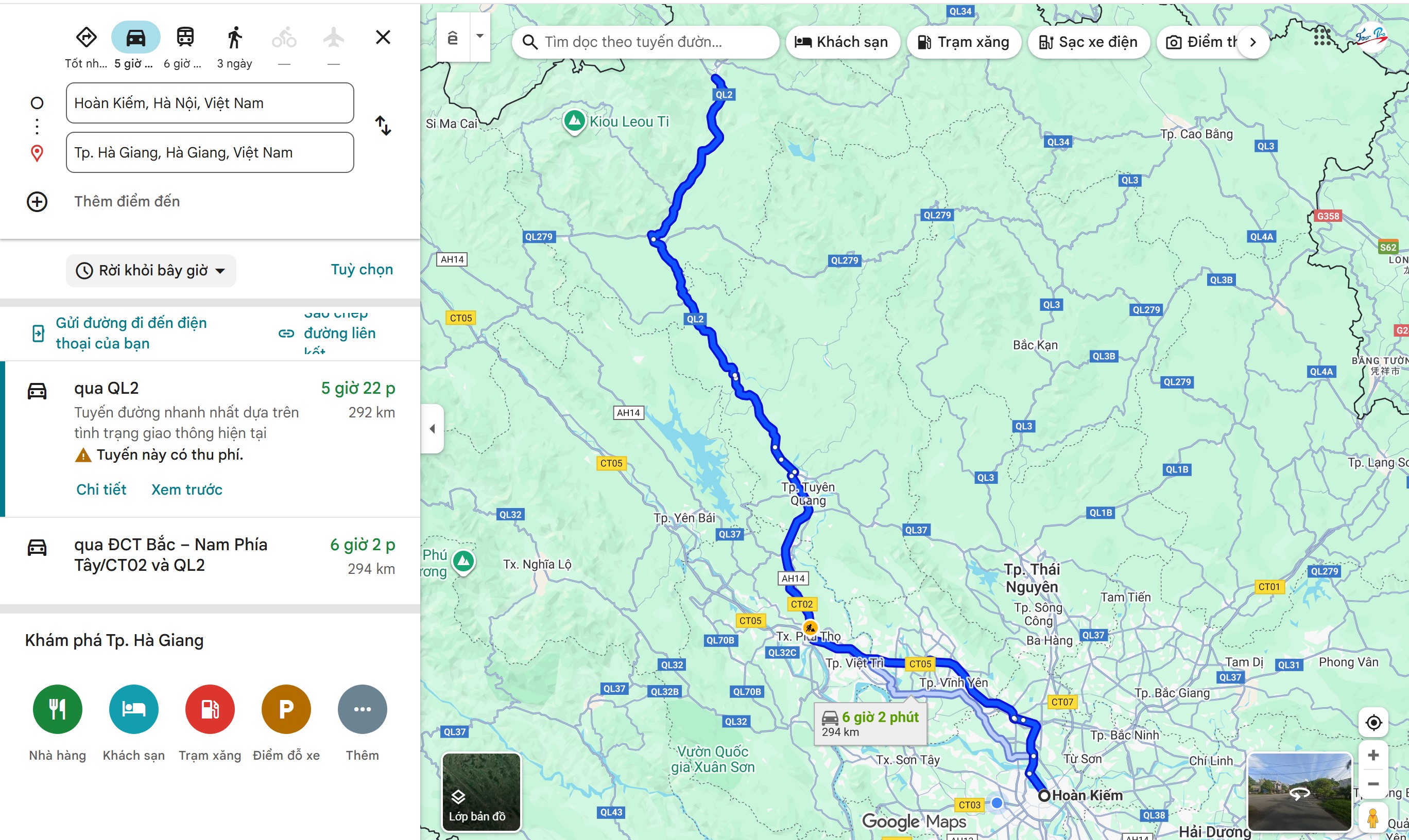 + Di chuyển bằng ô tô: Tuyến đường thuận tiện nhất là xuất phát từ Hà Nội theo cao tốc Nội Bài - Tuyên Quang sau đó tiếp tục đi theo quốc lộ 2 đến Hà Giang. Đây là cung đường bằng phẳng, dễ đi và tiết kiệm thời gian nhất hiện nay. Khi tự lái xe bạn nên xuất phát sớm để kịp tới Hà Giang trước khi trời tối, đồng thời chuẩn bị đầy đủ giấy tờ xe, kiểm tra phanh, lốp và nhiên liệu.