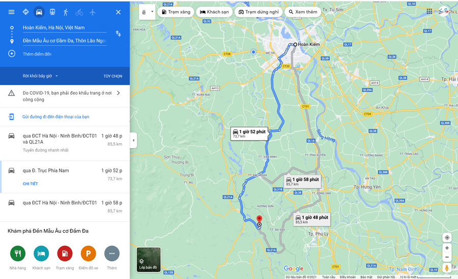 Bằng cách tải ứng dụng về điện thoại trên cửa hàng Google Play hoặc App Store, mở ứng dụng ở mục tìm kiếm nhập từ khóa “Đền Mẫu Âu Cơ Đầm Đa”. Sau đó nhấp vào mục lựa chọn phương tiện di chuyển, tiếp theo bấm bắt đầu để được điều hướng đường đi phù hợp.
