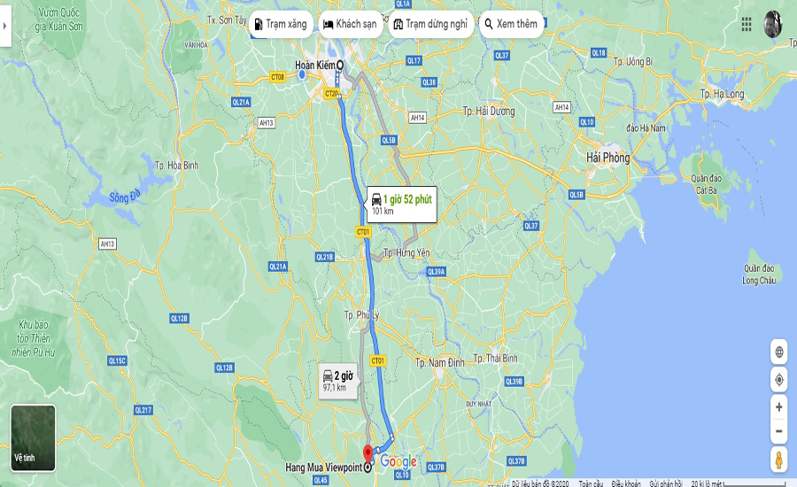 {Hang Múa Ninh Bình} theo hướng dẫn điều hướng, chỉ đường của ứng dụng Google Maps cách hà Nội gần 101km, mất 1 giờ 52 phút di chuyển đường bộ. Nếu bạn có sẵn xe máy thì có thể đi dọc quốc lộ 1A qua đoạn Hà Nam rồi đi theo hướng Ninh Bình - Thanh Hóa, cách này chỉ dành cho những người có sức khỏe ham mê khám phá thôi nhé. Bên cạnh đó, bạn có thể lựa chọn xe Limousine có giá vé từ 150.000đ đến 360.000đ tùy hạng.