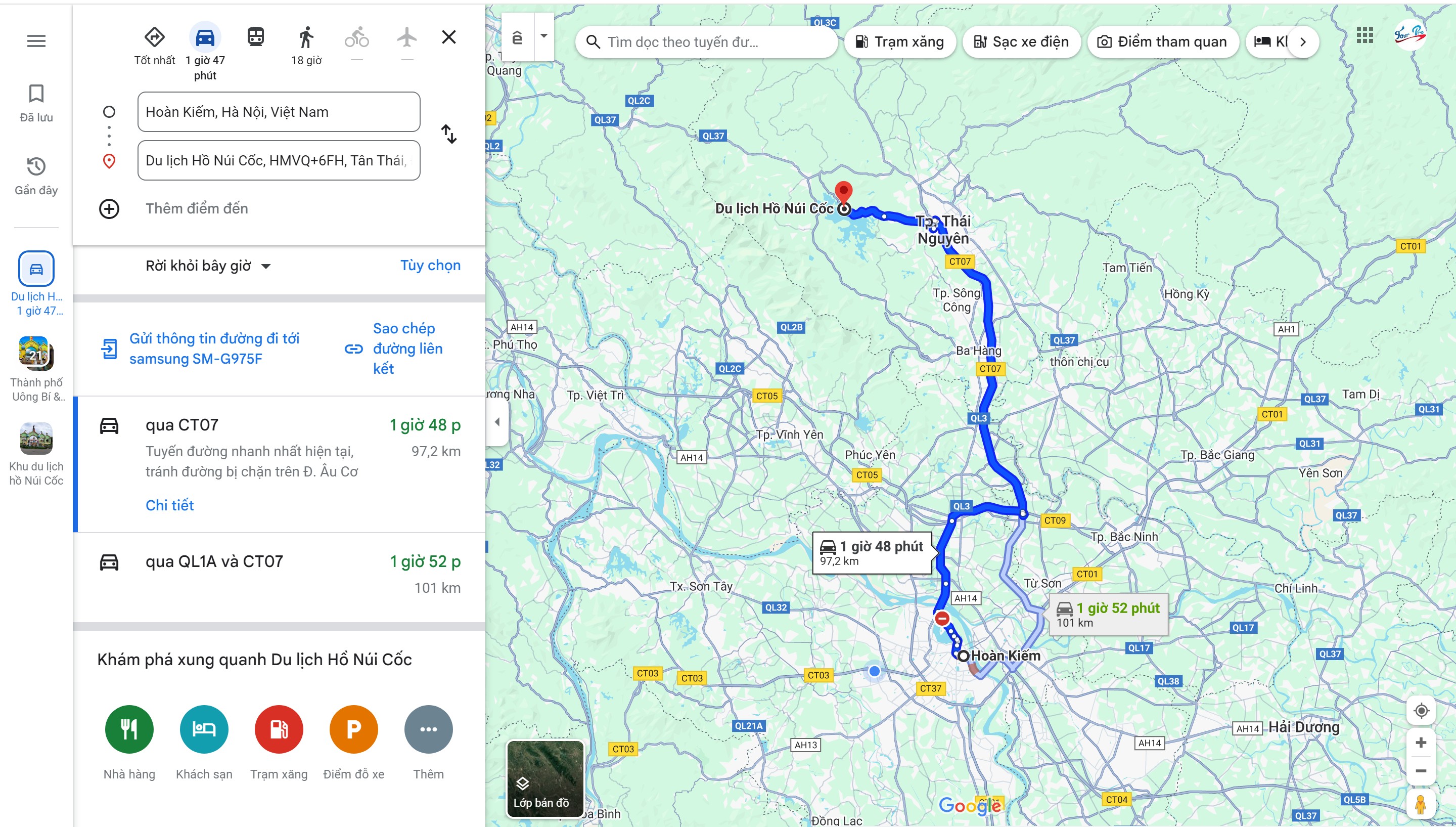 + Để chuyến đi trở lên đơn giản hơn, du khách có thể tham khảo gợi ý sử dụng ứng dụng Google Maps. Bằng cách tại về điện thoại, mở ứng dụng. Nhập vào ô tìm kiếm từ khóa “Khu du lịch Hồ Núi Cốc - Thái Nguyên”. Sau đó nhấp mục lựa chọn phương tiện và bấm bắt đầu để được gợi ý và điều hướng dễ dàng nhé.