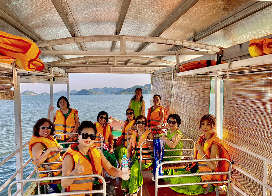 Tự do tự tại tận hưởng bầu không khí trong lành giữa mênh mông lòng hồ núi Cốc khi di chuyển bằng thuyền tới tham quan khu nhà cổ, đảo Tiên Nằm, đảo Núi Cái, đảo dê, đảo khỉ, đảo cò,...
