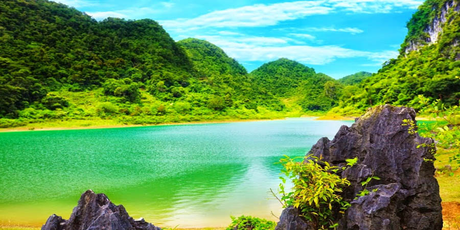 Cây cối xanh mướt trên những dãy núi hàng ngày soi mình xuống làn nước trong lành của hồ khiến nơi đây bình yên đến lạ thường làm người ta không nói lên lời trước cảnh sắc quá đỗi bình yên, nguyên sơ nơi đây.