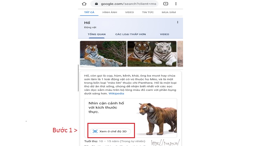 Bước 1: Truy cập vào Google Chrome hoặc Safari > Bấm tên loài động vật bạn muốn tìm kiếm vào ô (Ví dụ: Hổ, Rùa, Mèo… > Nhận kết quả tìm kiếm, nhấp vào ô “Xem ở chế độ 3D”