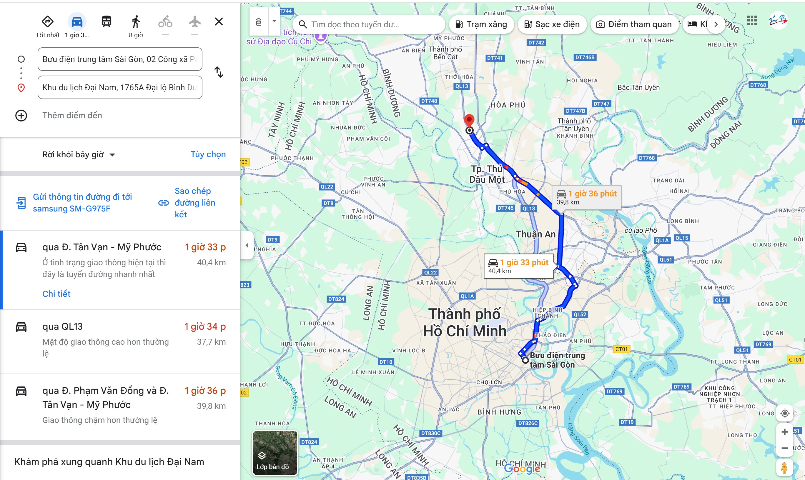 {Khu du lịch Đại Nam Bình Dương} có vị trí nằm cách trung tâm hành chính của tỉnh Bình Dương là thành phố Thủ Dầu 1 khoảng 8,8km, cách trung tâm thành phố Hồ Chí Minh 40,4km, mất 1 giờ 33 phút di chuyển đường bộ bằng ô tô theo chỉ dẫn từ ứng dụng Google Maps. Vậy nên để giúp du khách thuận tiện hơn trong việc lập kế hoạch di chuyển, chúng tôi sẽ gợi ý một vài cung đường cụ thể phù hợp với từng loại phương tiện.