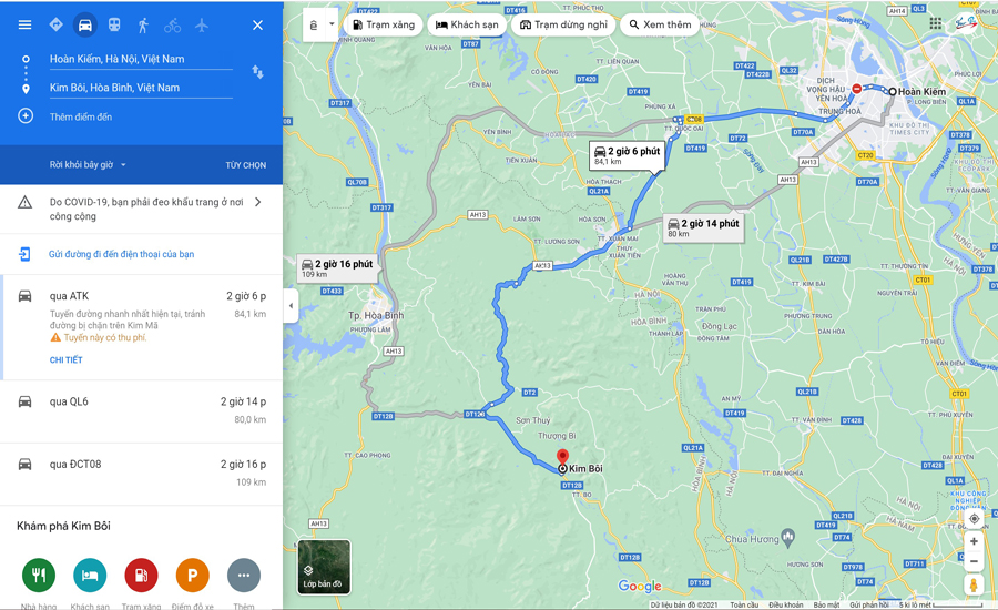 + Để thuận tiện hơn trong việc tìm đường, du khách có thể tải ứng dụng chỉ đường Google Maps trên điện thoại thông minh. Sau đó lựa chọn điểm đến và cài đặt phương tiện phù hợp là bạn sẽ nhận được chỉ dẫn chi tiết cung đường di chuyển tới Kim Bôi.