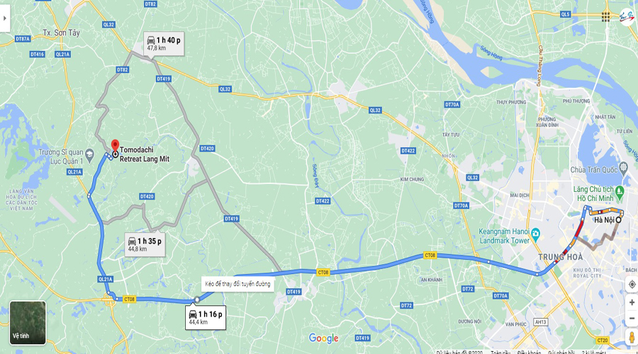 Để đến được Tomodachi Retreat - Làng Mít, bạn có thể di chuyển theo hướng Đại Lộ Thăng Long - Láng Hòa Lạc - QL21A - rẽ phải vào Thôn Đồng Trạng, xã Cổ Đông - sân bóng Chinh Nguyên - Làng Mít. Thời gian di chuyển khoảng 1h16 phút.