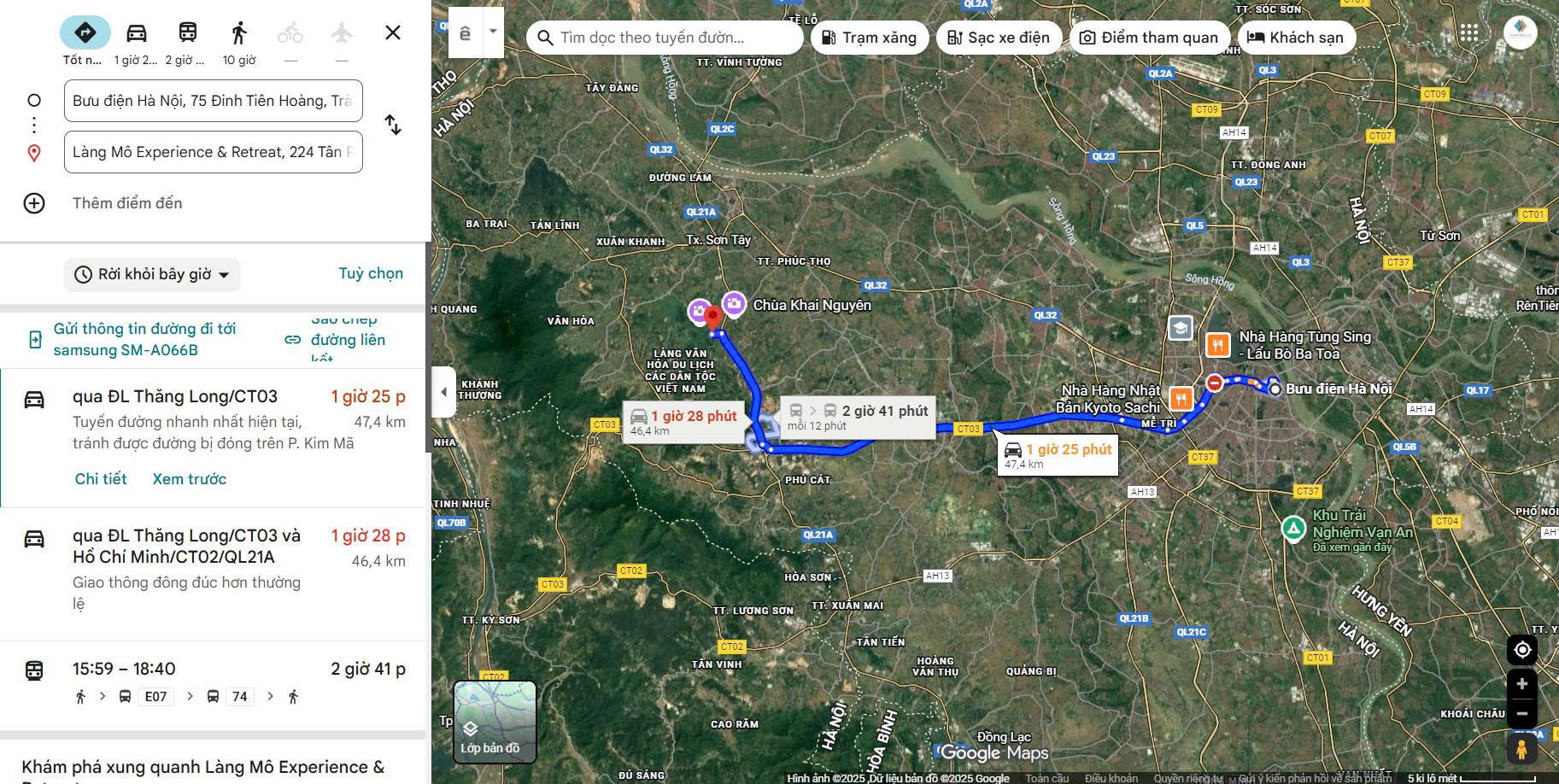+ Di chuyển bằng ô tô: Hành trình càng thuận tiện hơn bởi tuyến đường chủ yếu là trục lớn, dễ đi, bạn chỉ cần theo hướng Trần Duy Hưng → Đại Lộ Thăng Long → Đến nút giao Hòa Lạc → Quốc lộ 21A → Đồng Mô → Làng Mô. Đi ô tô giúp bạn di chuyển thoải mái, an toàn, đặc biệt phù hợp cho gia đình có trẻ nhỏ hoặc nhóm bạn đi đông cần không gian rộng rãi và tiện nghi.