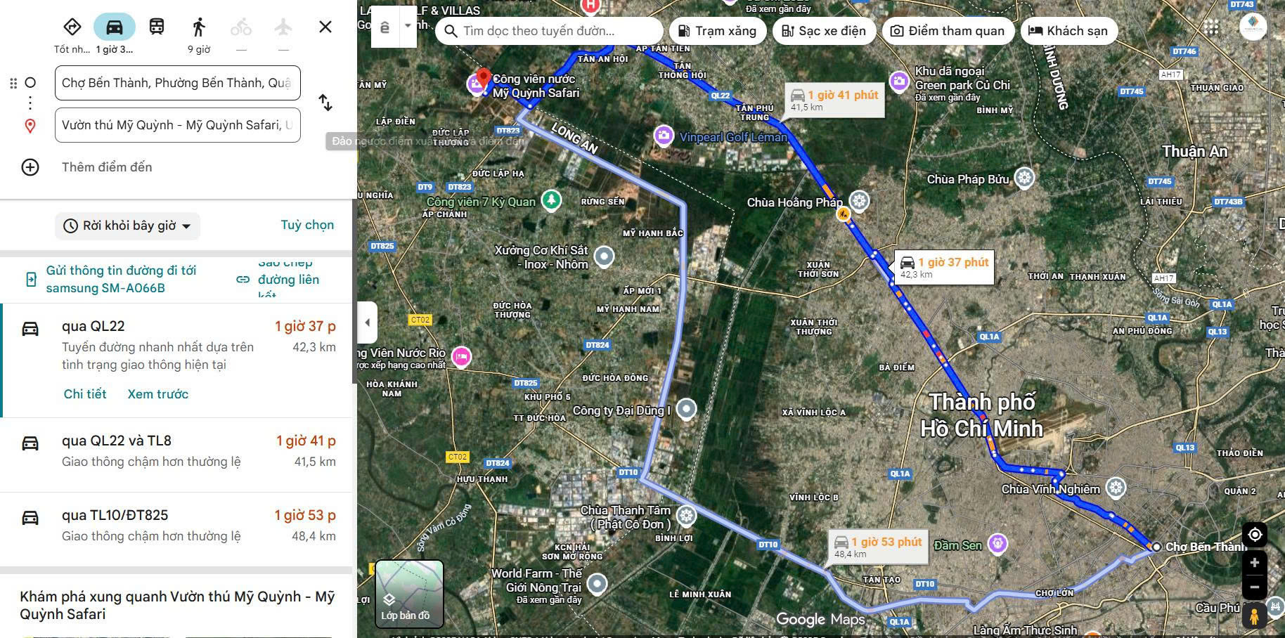 {Mỹ Quỳnh safari Long An} cũ theo chỉ dẫn từ Google Maps, nằm cách trung tâm thành phố Hồ Chí Minh là Chợ Bến Thành 42,3km và mất khoảng 1 giờ 37 phút di chuyển ô tô bằng đường bộ. Du khách có nhiều lựa chọn để đến Mỹ Quỳnh Safari, từ vi vu qua những con đường làng miền Tây đến di chuyển theo các tuyến quốc lộ chính. Dưới đây là các phương án phổ biến giúp bạn dễ dàng chọn được cách đi thuận tiện nhất cho hành trình.