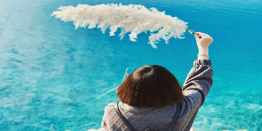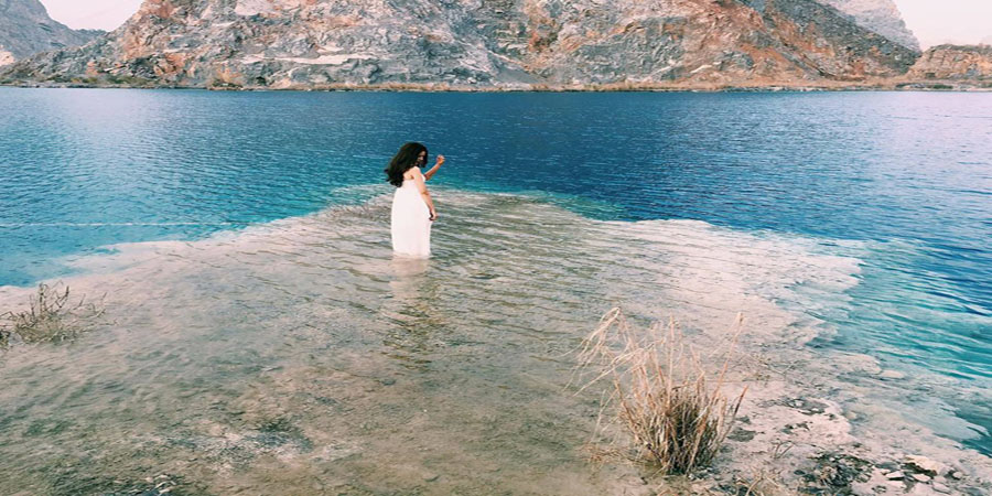Giữa núi rừng hoang sơ, bên những vách núi đá nhiều màu sắc, một hồ nước trong vắt có màu xanh ngọc bích hiện lên in bóng mây trời.
