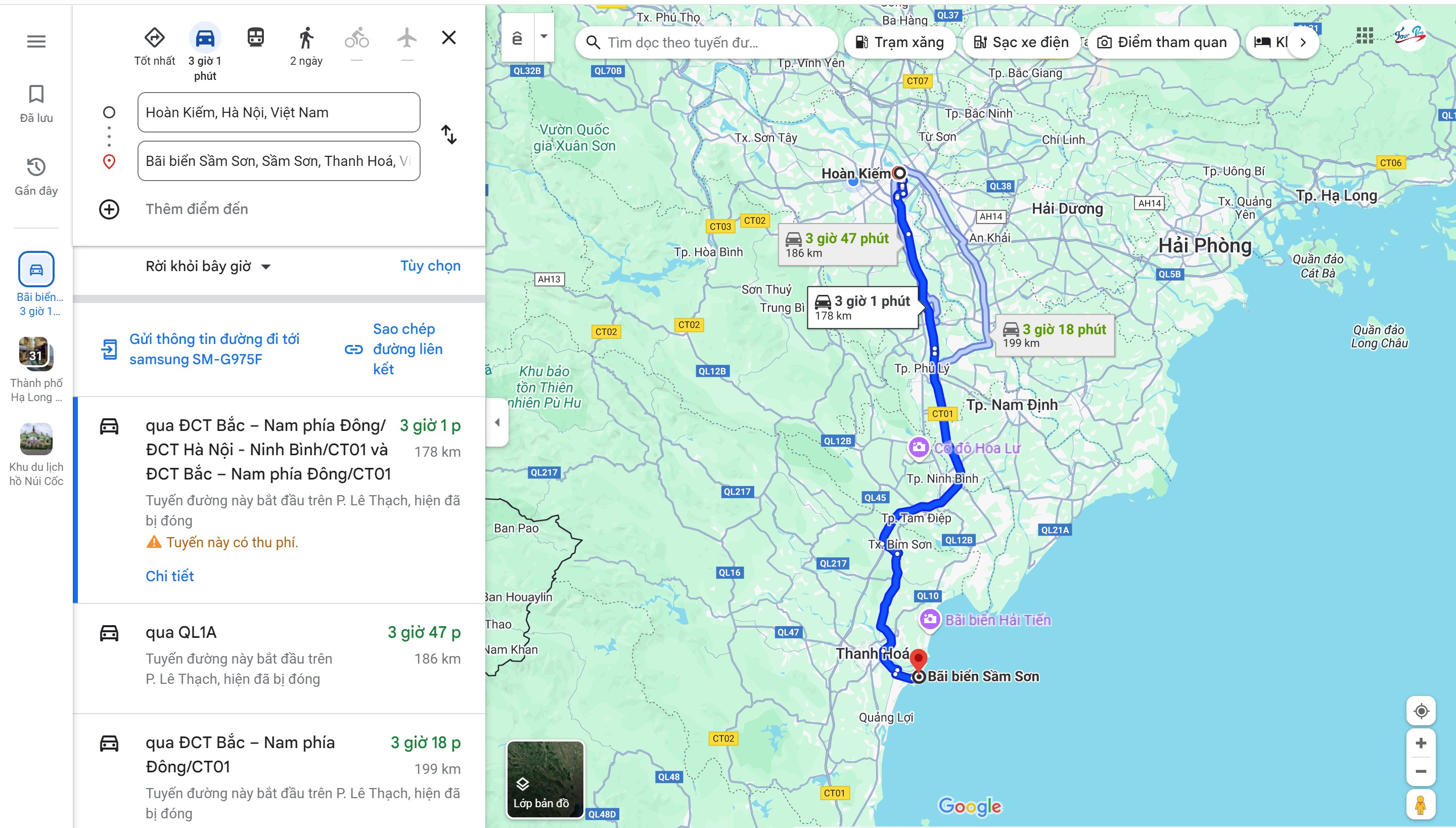 Ngoài ra để cho thuận tiện, bạn có thể tải ứng dụng chỉ đường Google Maps về điện thoại. Từ ô tìm kiếm gõ từ Khóa "Sầm Sơn - Thanh Hóa" và sau đó nhấp mục phương tiện du khách dự định di chuyển. Nhấp tiếp bắt đầu và đi theo điều hướng là có thể đến Sầm Sơn mà không lo lạc đường.
