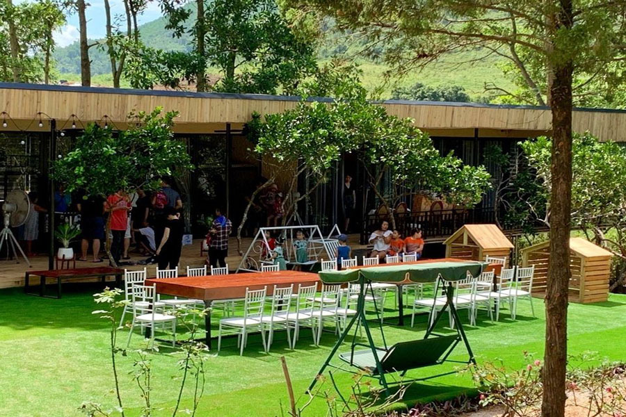 Với khuôn viên rộng mang đậm chất làng quê Việt Nam, đến với nơi đây bạn còn được tận hưởng và trải nghiệm những trò chơi thuở thơ ấu như: thả diều, bắt bướm, câu cá,.....