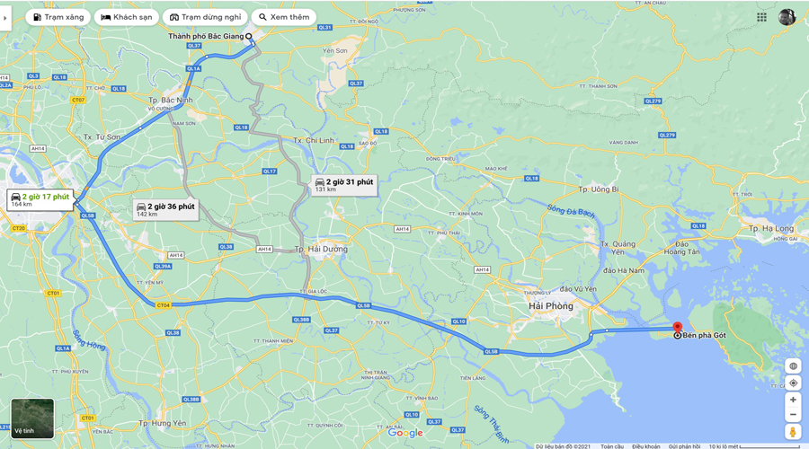 Quãng đường bộ từ Bắc Giang đến Cát Bà bao gồm hai chặng khoảng 160km. Gồm đoạn đường từ thành phố Bắc Giang đến bến phà Gót 142km và từ bến Cái Viềng về thị trấn Cát Bà 25km theo chỉ dẫn từ Google Maps.