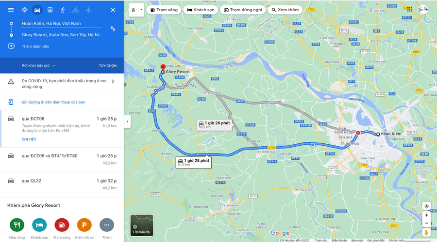 + Gợi ý thêm cho du khách, nếu bạn khó hình dung về đường đi {Glory resort Xuân Sơn Sơn Tây Hà Nội} hãy hỏi ứng dụng Google Maps. Tải ứng dụng về điện thoại tại ô tìm kiếm nhập từ khóa “Glory Resort” sau đó nhấp vào mục chỉ đường. Lựa chọn phương tiện dự định bạn di chuyển, nhấp bắt đầu để được điều hướng theo tuyến đường phù hợp nhất.