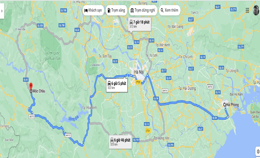 Khoảng cách di chuyển trong suốt lịch trình từ Hải Phòng đến Mộc Châu, Sơn La được điều hướng Google Maps gợi ý tốt nhất có quãng đường 322km và thời gian di chuyển 6 giờ 5 phút.