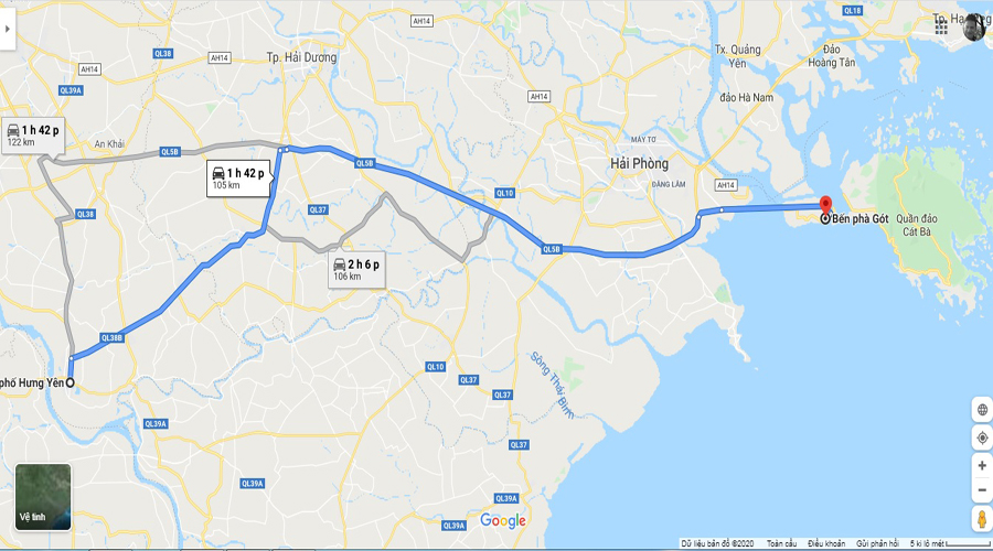 Kinh nghiệm du lịch Hưng Yên - Cát Bà tại Tour Pro cho rằng hành trình du lịch Cát Bà từ Hưng Yên, thì tuyến đường thuận tiện nhất theo chỉ dẫn Google Maps để bạn di chuyển là QL 5B (cao tốc Hà Nội - Hải Phòng). Từ trung tâm thành phố bạn di chuyển theo đường hướng lên cao tốc Hà Nội - Hải Phòng. Đến nút giao Tràng Cát trên QL 5B bạn đi theo biển chỉ dẫn hướng đi cầu Tân Vũ - Lạch Huyện thẳng đến bến phà Gót, Cát Hải.