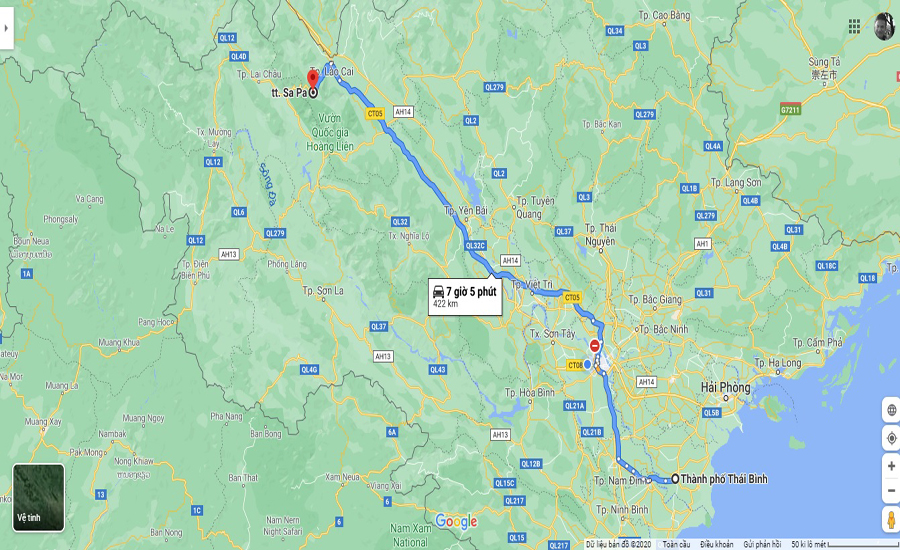 Khoảng cách di chuyển được điều hướng Google Maps gợi ý tốt nhất có quãng đường 422km và thời gian di chuyển mất 7 giờ 5 phút.