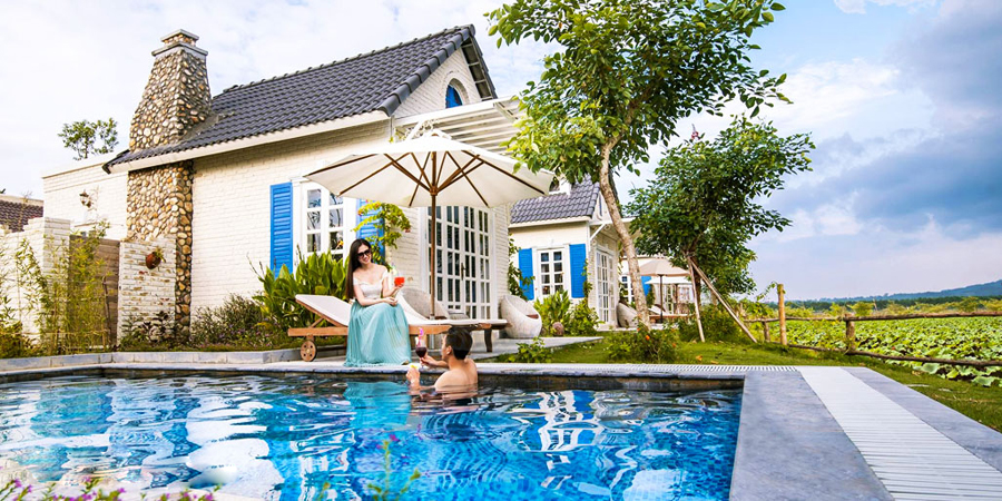 + Khu Sen Bungalow - Lotus Bungalow: Tọa lạc ngay cạnh đầm sen với view hồ rộng lớn, khu Bungalow độc đáo tại Vườn Vua resort, xinh đẹp với những ngôi nhà gạch màu trắng có cửa sổ xanh lãng mạn với bể bơi riêng cùng không gian lãng mạn mang đến cho bạn cảm giác thư thái và bình yên. Giá phòng dao động từ 2.000.000 vnđ - 3.000.000 vnđ/phòng/đêm.