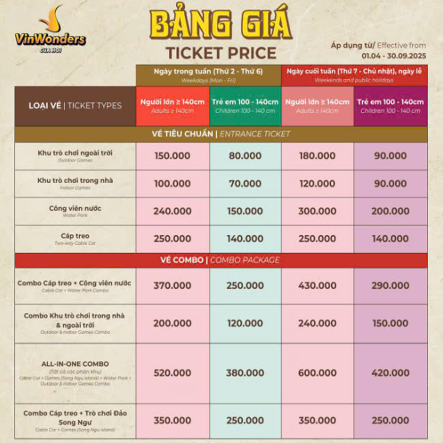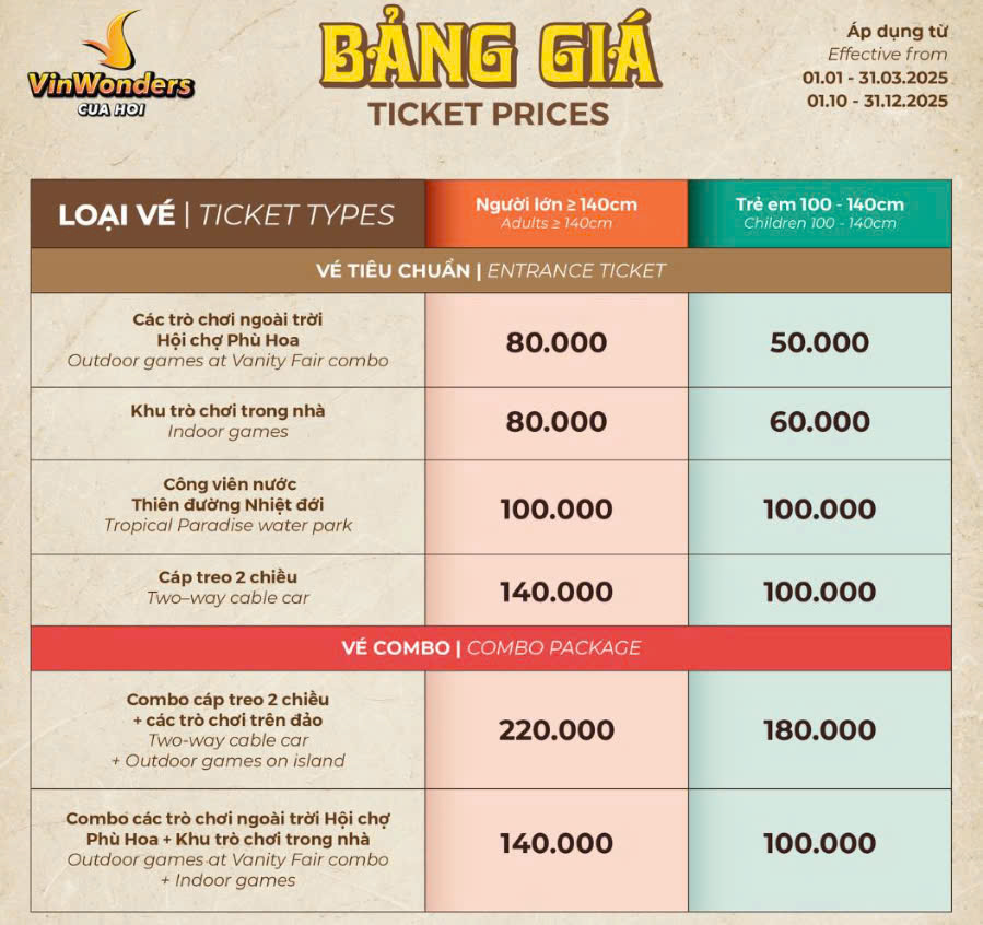 {VinWonders Cửa Hội Giá vé} áp dụng từ tháng 1 - 31/3/2025 và từ tháng 10 - 31/12/2025: