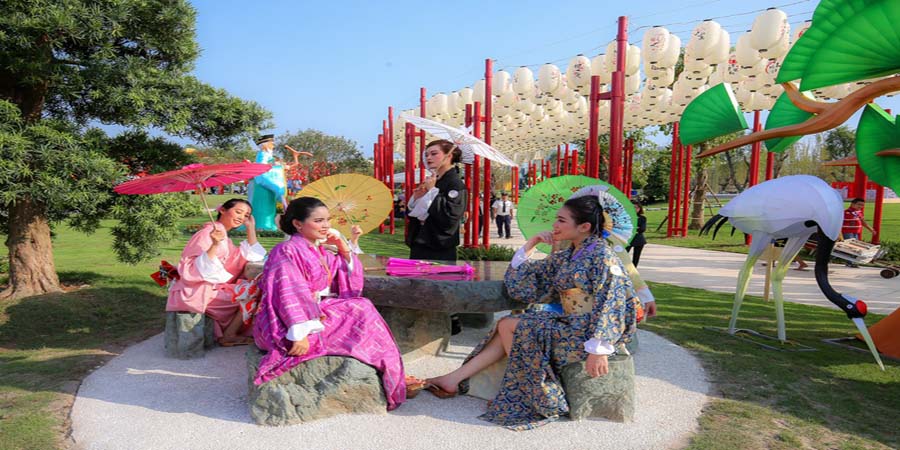 Đáng chú ý, nổi bật trong khu vườn là một công viên đèn lồng với gần 20 loại đèn khác nhau, hàng ngàn mẫu đèn lồng truyền thống Nhật Bản cùng các đèn lồng linh vật, đèn lồng nhân vật cổ tích, nổi bật có: Tiểu đình đèn lồng lớn,  Con đường đèn lồng với hơn 2000 chiếc đèn treo trên cao, Tháp đèn lồng nổi tiếng Nhật Bản Noshiro Fuyajo cao đến 14m, Dàn đèn lồng cá chép trên mặt hồ... Tác giả của hơn 5000 chiếc đèn lồng các loại này là Haitian Lanterns, đơn vị thiết kế sản xuất đèn lồng hàng đầu thế giới - đối tác của các Thế vận hội Olympic hay Disneyland...
